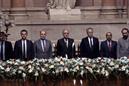 François Mitterrrand, Presidente da França, Barbosa de Melo, Presidente da Assembleia da República e Mário Soares, Presidente da República, ao centro na imagem, na Sala das Sessões da Assembleia da República.