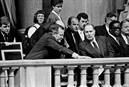 Da esquerda para a direita, na primeira fila, George H. W. Bush e François Mitterrand na tomada de posse de Mário Soares.