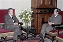 O Presidente da República eleito, Mário Soares, à esquerda, em reunião com o Presidente da República cessante, António Ramalho Eanes, no Palácio de Belém.