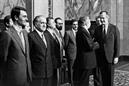 Mário Soares cumprimenta George H. W. Bush no dia da sua Tomada de Posse como Presidente da República. À esquerda, na imagem, Aníbal cavaco Silva, Primeiro-Ministro e Monteiro do Amaral, Presidente da Assembleia da República.
