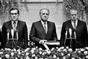 Da esquerda para a direita, António Ramalho Eanes, Presidente da República cessante, Fernando Monteiro do Amaral, Presidente da Assembleia da República, com a Constituição, e Mário Soares na Sessão Solene da sua Tomada de Posse como Chefe de Estado.