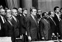 Personalidades estrangeiras assistem à cerimónia de tomada de posse de Mário Soares como Presidente da República. Ao centro, na primeira fila, George H. W. Bush, Vice-Presidente dos EUA, com Nino Vieira, Presidente da Guiné-Bissau à sua esquerda.