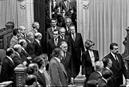Cerimónia Solene de Tomada de Posse de Mário Soares como Presidente da República. O Presidente da República cessante, António Ramalho Eanes, entra na Sala das Sessões seguido pelo Presidente da Assembleia da República, Fernando Monteiro do Amaral, pelo Presidente da República eleito, Mário Soares, pelo Primeiro-Ministro, Aníbal Cavaco Siva e Membros do X Governo Constitucional.