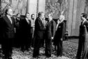 Mário Soares cumprimenta François Mitterrand no Salão Nobre da Assembleia da República.