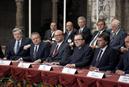 Cerimónia da assinatura do Tratado de Adesão de Portugal à CEE. O Primeiro-Ministro Mário Soares, segundo a contar da esquerda, Bettino Craxi, Primeiro-Ministro Italiano, Giulio Andreotti, Ministro dos Negócios Estrangeiros de Itália e Felipe Gonzalez, Primeiro-Ministro de Espanha, no Mosteiro dos Jerónimos, em Lisboa.