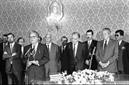 Discurso de Carlos Melancia após ser empossado como Governador de Macau. Em primeiro plano encontram-se, Carlos Melancia, no uso da palavra, o Presidente da Assembleia da República, Fernando Monteiro do Amaral e o Presidente da República Mário Soares no Palácio de Belém.