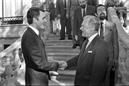 O Primeiro-Ministro Cavaco Silva, à esquerda na imagem, cumprimenta Poul Holmskov Schlüter, Primeiro-Ministro da Dinamarca.