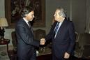 Mário Soares, Presidente da República, cumprimenta Felipe Gonzalez, Primeiro-Ministro de Espanha, no Palácio de Belém em Lisboa.