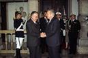 Mario Soares, Presidente da República, à direita na imagem, cumprimenta José Sarney, Presidente do Brasil.